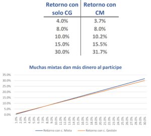 La idea es que, dado un fondo con sólo CG, siempre se puede diseñar una CM que dé más dinero al inversor. ¿Cómo? Las CG aplican a un monto mucho mayor que las CE. Por tanto, basta con fijar una CM con una CG suficientemente más baja que la del fondo que sólo cobra CG. Como en los años de bajada no se cobra CE, nos centraremos en años con retorno positivo. Veámoslo primero teóricamente y luego prácticamente.