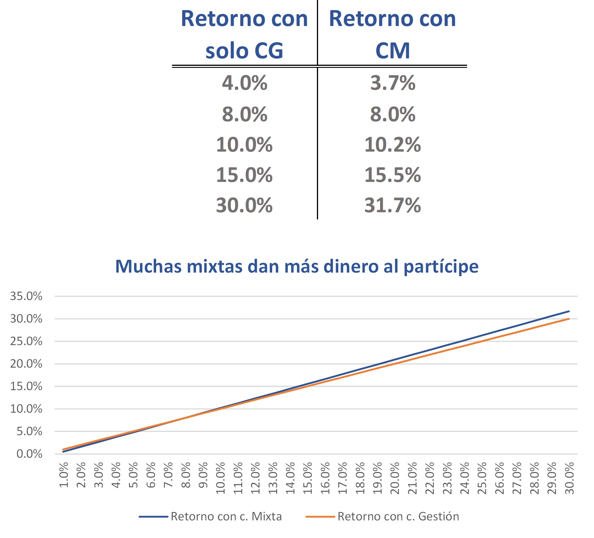 Está extendida la creencia de que los fondos de inversión sólo deben cobrar una comisión de gestión (CG). Pero no está claro que sólo una comisión de gestión sea mejor para el inversor. Pues vamos a ver que con una comisión mixta se puede dar más dinero al partícipe que con sólo una comisión de gestión (CM: comisión de gestión y comisión de éxito (CE)).