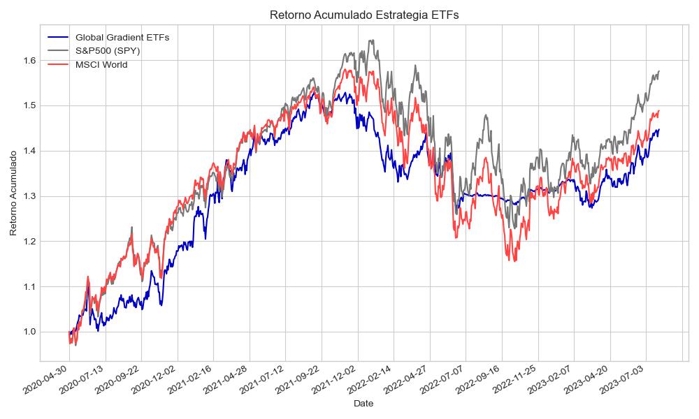 Curva de capital de la estrategia (retorno acumulado): el siguiente gráfico muestra la evolución real del rendimiento de la cartera de ETFs del Global Gradient, que ha generado un 44.7% acumulado.