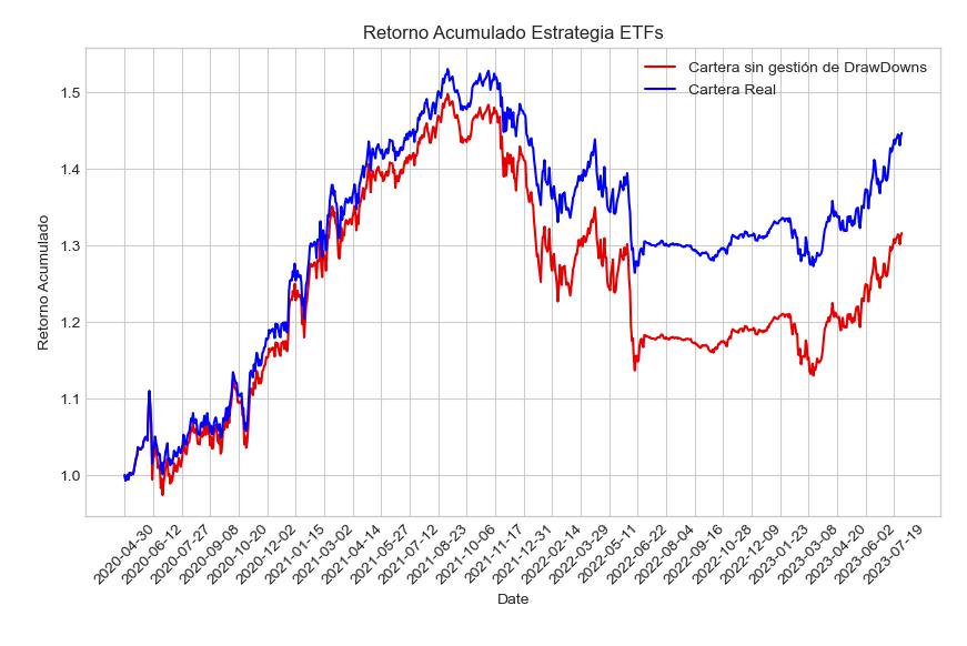 Desde el comienzo de la operativa (30 abril 2020) y hasta el momento de este estudio (1 agosto 2023) esta estrategia ha implementado 19 carteras de ETFs. El horizonte habitual de inversión de las carteras es de 3 meses. Además de ello, hay dos tipos de ajustes en las carteras: (a) al principio de cada mes se ajustan los pesos que se hayan desviado demasiado de su peso teórico, (b) durante cada mes, se reduce un 30% de la exposición de aquellos ETFs que tengan una caída mayor que el umbral definido para cada uno. Estos ETFs se ajustarán de nuevo a su peso teórico a principio del mes siguiente.