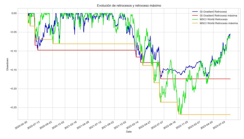Como se puede ver en la siguiente tabla, al final del período abril 2020 – julio 2023 el retorno anualizado de nuestra estrategia es ligeramente inferior al índice global, pero con bastante menos volatilidad (12.5% vs 17.8%), lo que hace que el retorno que se obtiene por cada unidad de riesgo (Sharpe Ratio) sea mucho mejor en nuestro caso (0.96 vs 0.73). Nuestra gestión del riesgo también se puede ver en la caída máxima experimentada por nuestra cartera, que en ese período fue del 17.4% mientras que en los índices global y americano fue del 27% y 25%, respectivamente. En la siguiente tabla mostramos estos resultados y más abajo un gráfico con la evolución temporal de los drawdowns y de la caída máxima del GG ETFs y del índice global.