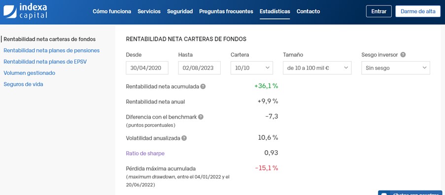 Esta sección explica brevemente la estrategia de ciclo macro-mercado con la que se gestiona el segmento de ETFs[1] de la cartera real del fondo Global Gradient (Gestión Boutique VIII Global Gradient[2], primer fondo de acciones y ETFs en España gestionado íntegramente con modelos de Machine Learning (ML)[3], con ISIN ES0131445126, y disponible en MyInvestor y AllFunds[4]). También detalla los resultados reales de dicha estrategia desde abril 2020 (fecha de lanzamiento), que ha alcanzado un 12% de retorno anualizado con un 12.5% de volatilidad (a 31 de julio de 2023). En este período, el retorno es significativamente mejor que el perfil más agresivo del Roboadvisor español más conocido (9.9%-10.0%, ver capturas de su web al final del artículo), y la volatilidad notablemente más baja que el S&P 500 (SPY, 19%) o el MSCI World (URTH, 18%).