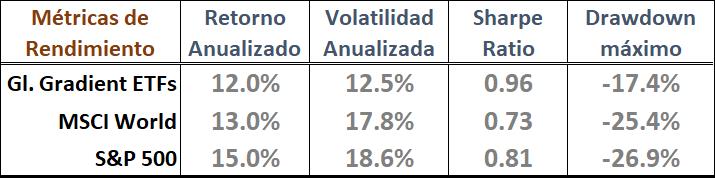 Aunque el índice más relevante es el global, también mostramos el S&P 500 (ticker SPY), que con un 57.5% acumulado al final del período está algo más por encima nuestro que el global. Nuevamente, en términos de Sharpe también GG ETFs está por encima.