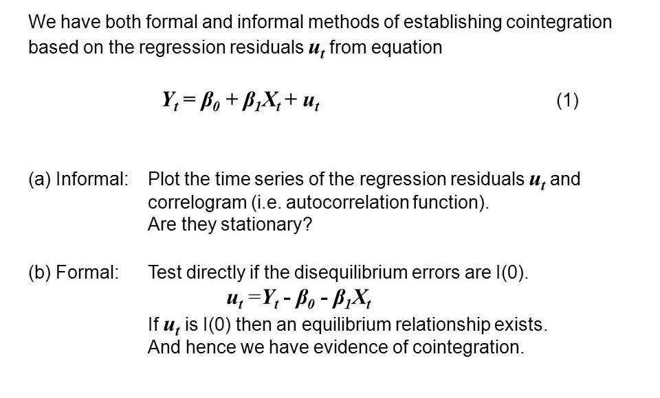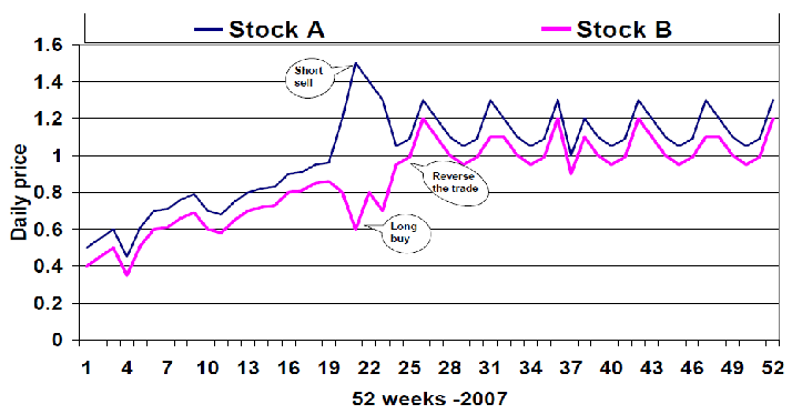 En el fondo es averiguar si hay una relación lineal entre ellos (normalmente con los test de Dickey-Fuller o de Johansen), de modo que si existe dicha relación, cuando esta se desvía de su comportamiento medio aumenta la probabilidad de revertir, y se suele utilizar el z-score del ratio para calcular las ‘señales’ para la operativa. De modo que por ej cuando el z-score pasa de 2 (-2) desviaciones, se va corto (largo) en el ratio. Es decir corto numerador/largo denominador (largo numerador/corto denominador).