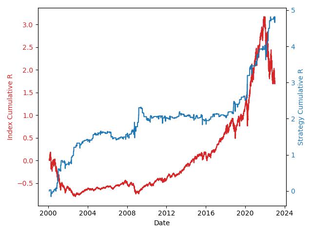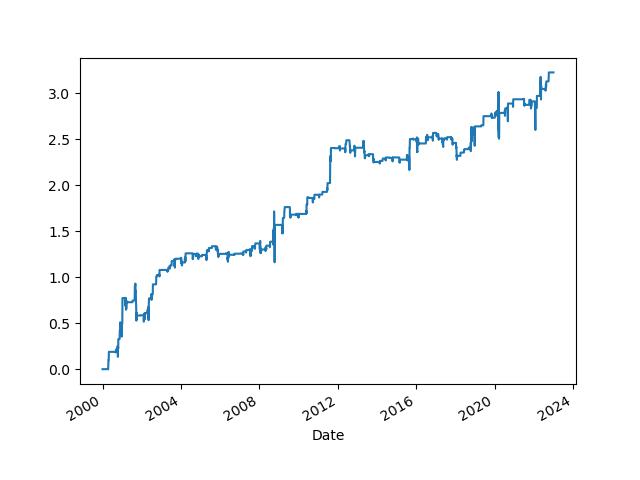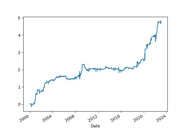 ¿Qué tal lo haría entonces una estrategia de pares? La estrategia se activaría al pasar 2(-2) desviaciones y hasta que desapareciera la señal al volver a un entorno de la media. Calculada hasta final de 2022, esta sería la curva de equity desde aprox 1998, equivalente a un 8.2% anualizado: