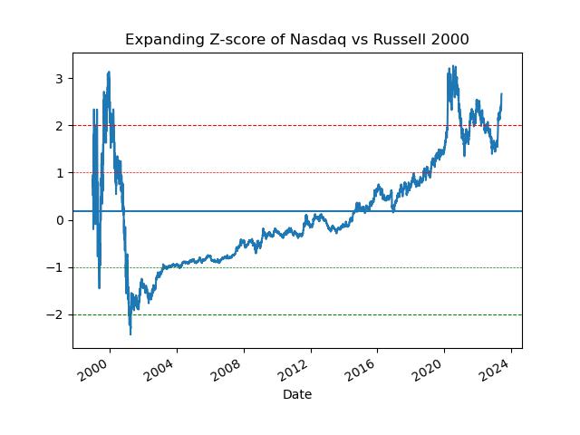 Pero aquí hay que tener cuidado con los cálculos que se hacen al derivar las ‘señales’. Por ej el gráfico 4 muestra el z-score de toda la serie desde los 90. Tanto en la crisis dotcom (~2000) como en los últimos 3 años el ratio habría pasado de 2 desviaciones. Pero al utilizarlo en una estrategia incurriríamos en look-ahead bias. Sería mejor un rolling z-score o un expanding z-score.