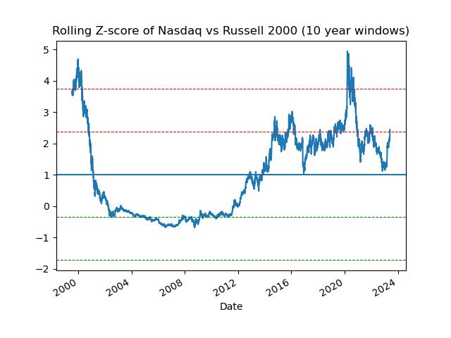 Y si calculásemos el z-score sobre rolling windows de 10 años, la señal actual no sería tan clara, porque en 2013-2023 hubo varios puntos altos del ratio, y al hacer la media la señal queda más baja que por ej de 2010 a 2020, porque el pico de 2020 era el más alto de esa ventana