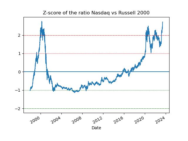 En los últimos días se ha comentar la divergencia entre el Nasdaq ($NDX, $IXIC) y el Russell 2000 ($RUT): YTD 35.4% vs 6.6% (a 12 de junio de 2023). Por ej estar en máximos históricos desde los años 80, como indica este primer gráfico del ratio entre el precio de ambos.